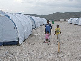 Homely is a word that does not describe the other camp I saw that afternoon. Placed outside of town in a moon-like landscape of bare mountains, rocks and same-shaped bubble tents, the UN and Haitian authorities have established a new site and begun moving some of the most vulnerable inhabitants from the overcrowded Petionville Golf Club settlement into mid-town. In the first few busloads, many families with children were moved. I am happy to see that they all wear bracelets, because it is a well-established fact that children are often at risk of being separated form their families in the normal chaos that accompanies such events. With no colors, nothing but straight lines and many men in uniform - there to provide security from surrounding mountain side camps such as the Obama Camp inhabitants who have not received much - it is hard to imagine a more child un-friendly environment. Hopefully that will get priority too, as it becomes a more established camp.